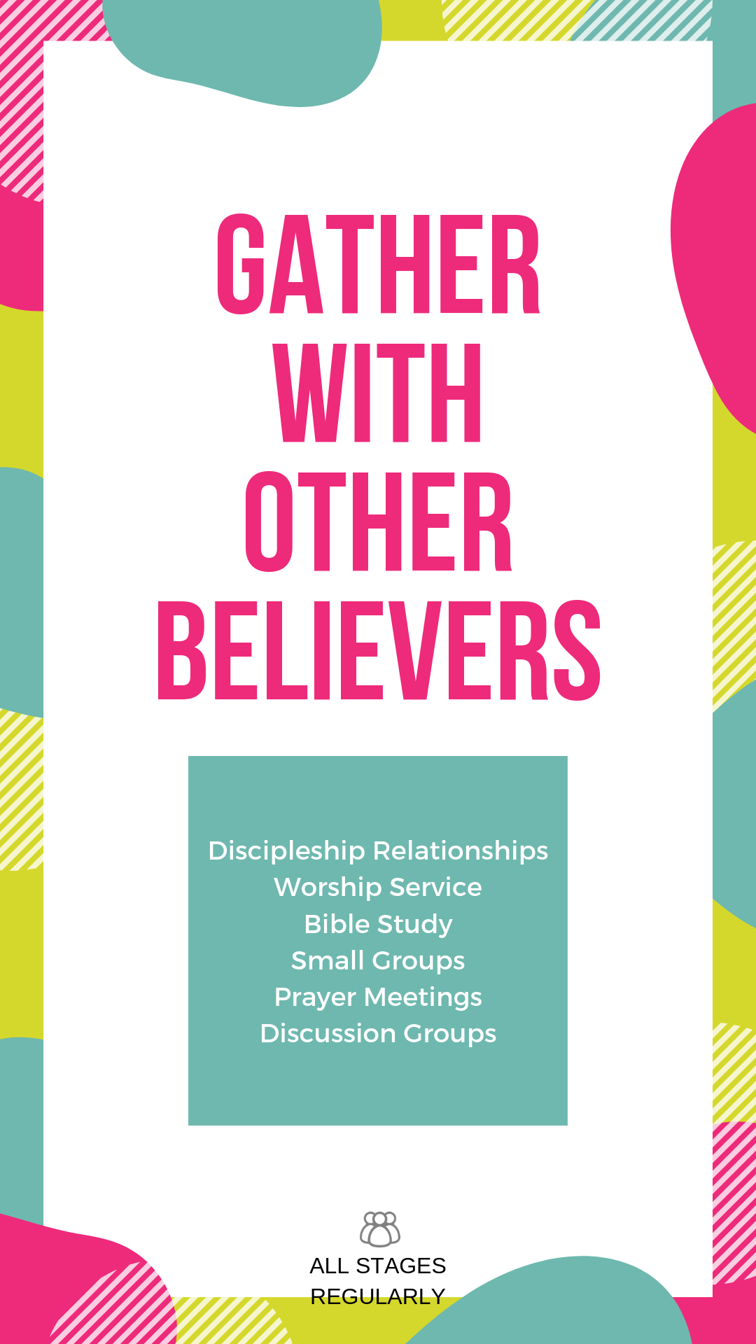 You can send these digital cards to your disciple to remind them which growth rhythms they should be working on. Each card has the name of the rhythm followed by a short explanation. Near the bottom there is the stage it is appropriate for and the expected frequency underneath (see example below). You can download each card by clicking (or tapping for mobile device) on the image and then right clicking (or holding down for mobile device) and choosing “Save Image.” Tip: Since the format is phone friendly, you can download all the rhythms to your photos on your phone in their own album and then send them to people you are helping as needed.
